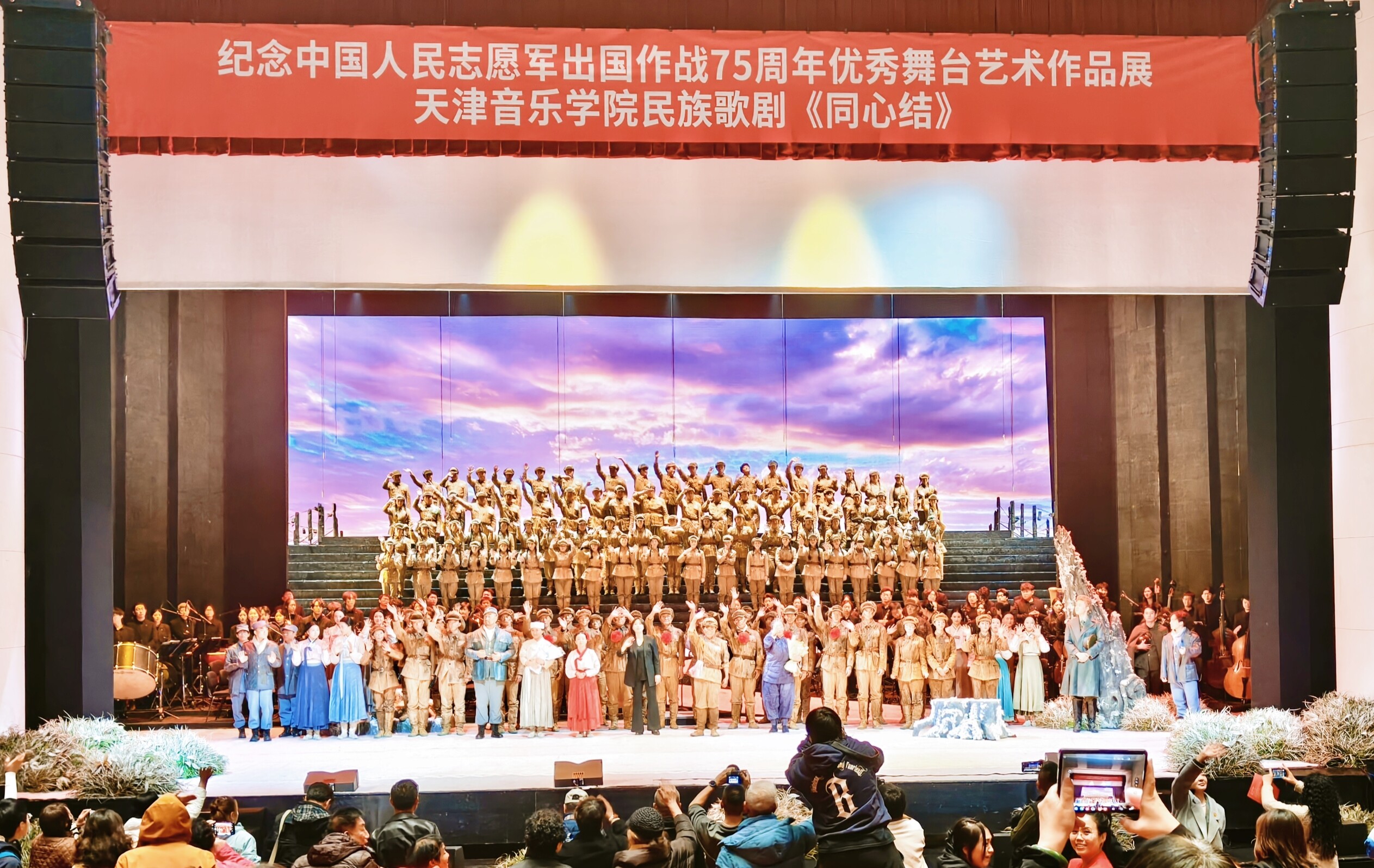 歌剧《同心结》由天津音乐学院院长、著名男高音歌唱家王宏伟领衔主演,携手全院200余名师生,以精湛的艺术造诣与饱满的情感投入,成功塑造了英雄黄继光的光辉形象。剧目以抗美援朝战争为历史背景,以象征中朝友谊的“同心结”为情感主线,讲述了黄继光及其战友与朝鲜人民在战火中用鲜血凝结的深厚情谊。全剧通过“救孤”“出征”“牺牲”等情节,展现了黄继光从普通战士到战斗英雄的成长轨迹。