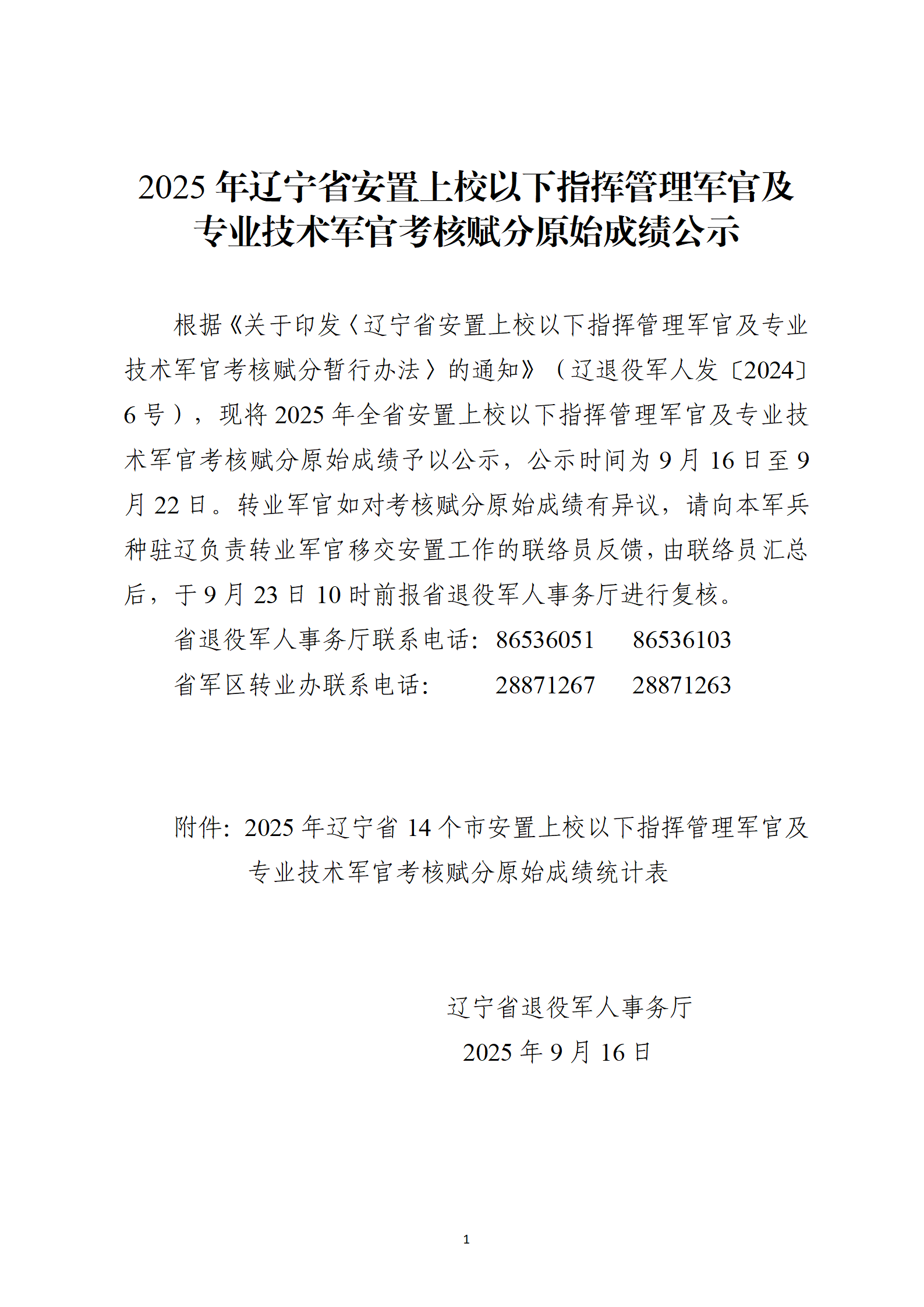 2025年辽宁省安置上校以下指挥管理军官及专业技术军官考核赋分原始成绩公示