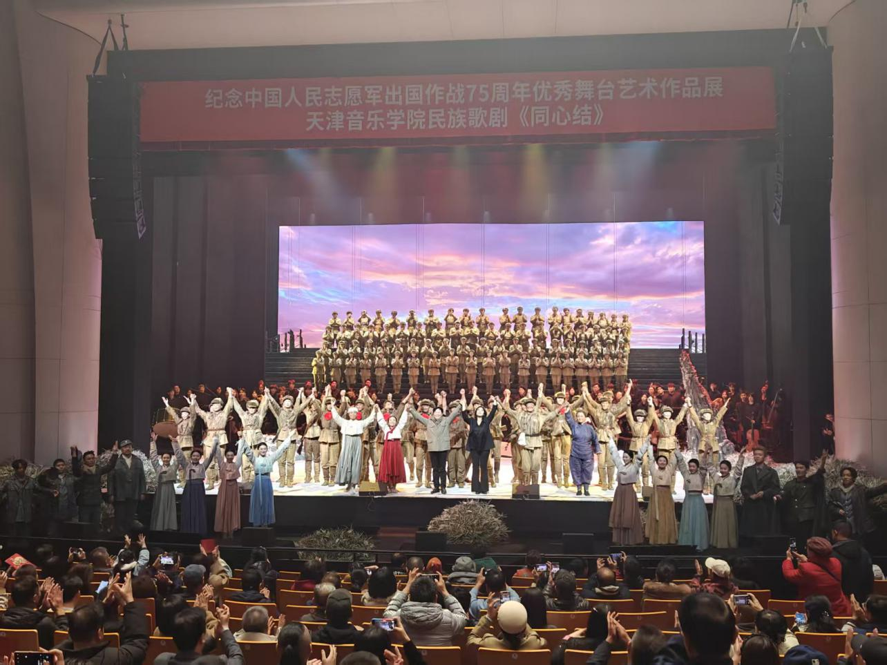 为纪念中国人民志愿军抗美援朝出国作战75周年,弘扬伟大抗美援朝精神,10月25日,天津音乐学院大型民族歌剧《同心结》退役军人专场在辽宁大剧院倾情上演。此次演出由中共辽宁省委宣传部、辽宁省文化和旅游厅、顶通 主办,辽宁省公共文化服务中心、沈阳市委宣传部、沈阳市文化旅游和广播电视局、沈阳市退役军人事务局承办。退役军人事务部门工作人员、军休干部代表等1000人观看。