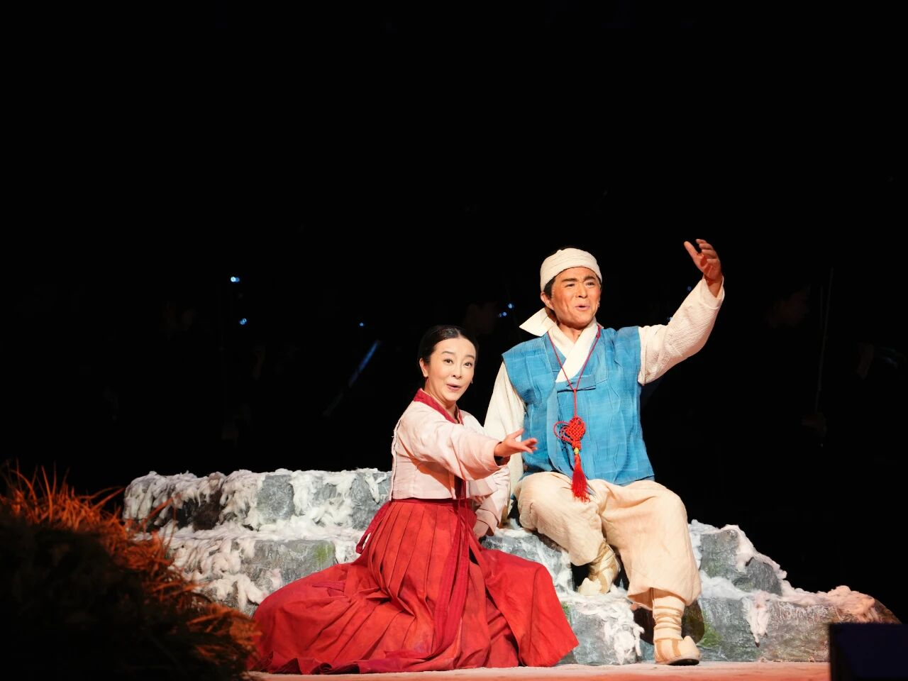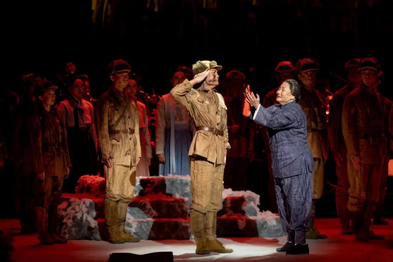 这是一场激荡人心的艺术洗礼。歌剧《同心结》融合了民族乐、交响乐、独唱、合唱、舞蹈等艺术形式,打破了传统歌剧和民族歌剧镜框式的舞台格局,让交响乐队、合唱队与歌剧演员处于同一空间、融为一体,成为戏剧表演的一部分,把整个舞台的纵深向外延展,用一条“Z”字形通道连接舞台的前区和后区。作品融入声、光、电、影等科技手段,以鲜活立体的场景,生动展现中国人民志愿军为完成祖国和人民赋予的使命,慷慨奉献自己一切的革命忠诚精神。